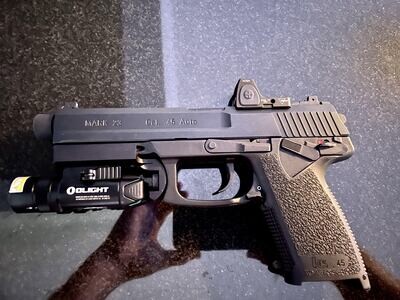 Așteptați-vă la o precizie echivalentă cu cea a celor mai bune pistoale personalizate de la pistolul semiautomat HK® Mark 23. Fiind unul dintre cele mai riguros testate pistoale de luptă proiectate vreodată, HK MK 23 are o reputație legendară pentru precizia fiabilă care datează din anii 1990, când a fost folosit pentru prima dată de cele mai de elită unități militare americane. Teste extinse de anduranță au demonstrat că acest pistol a îndeplinit cele mai stricte cerințe operaționale și de precizie cerute vreodată unui pistol de luptă. Țeava O-ring filetată cu profil poligonal trimite gloanțele la țintă cu o consistență epică. Detaliile de construcție de înaltă calitate includ trăgaci de calitate superioară, finisaj bleumarin rezistent la coroziune, glisieră din oțel prelucrat dintr-o singură bucată, cadru din polimer ranforsat cu fibre rezistent la coroziune, pârghie ambidextră de eliberare a încărcătorului și eliberare extinsă a glisierei. Extractorul se dublează ca un indicator de cameră încărcată pentru identificare rapidă. Sistemul HK de reducere a reculului, dispozitivul de siguranță lock-out, maneta de decocking montată pe ramă și maneta de siguranță ambidextră separată dau prioritate confortului și controlului încrezător în orice situație. Pistolul permite transportul armat și blocat în modul cu acțiune simplă, cu maneta de siguranță activată pentru armare rapidă. Gura de declanșare supradimensionată facilitează utilizarea cu mănuși. Utilizați canelurile de montare universale pentru a personaliza cu accesoriile compatibile alese de dvs.
